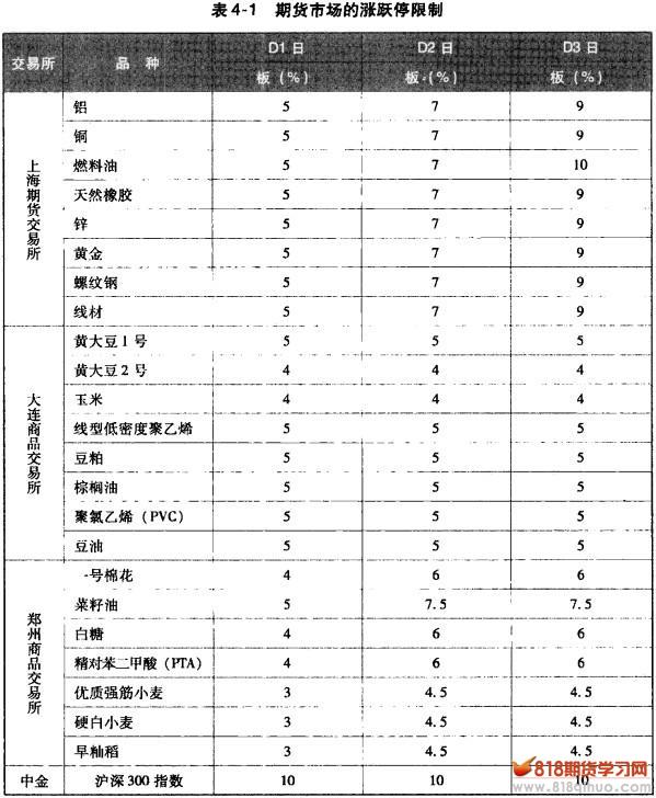 期货的涨跌停板制度,是指期货合约在一个交易日中的成交价格不能高于或低于以该合约上一交易日结算价为基准的某一涨跌幅度,超过该范围的报价将被视为无效,不能成交。我国实行的涨跌停板制度,有“触板不停”的特征,即股票价格或期货合约价格达到涨跌停板后,并不限制交易。在涨跌停价位或是两者的价格区间范围内,到当日收市为止,交易依然是可以进行的。目前,在发达国家或地区成熟的股票市场(如美国和我国香港),是没有涨跌停限制的。只有当股票市场发生巨大波动的时候,个别股票的涨跌停板限制才启动。发达国家或地区的期货市场,一般都是有涨跌停限制的(见表4-1),只有少数国家的交易所,如伦敦金属交易所(LME)未设涨跌停限制。