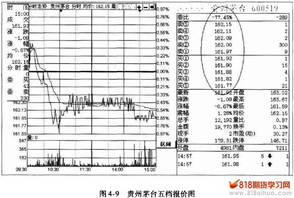 在股票的报价中,所有股票的最小跳动价位全部为0.01元。如果全部是连续报价的话,高价股票和低价股票的最小变动价位所对应的变动幅度就会相差很大。股价较高的股票,相邻两档的报价很可能只差几分甚至几角。现实的情形常常是:高价股的报价难以连续,相邻档位的价格容易断档,如图4-9所示。
