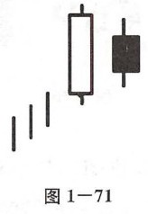 孕线(Harami)是在上升趋势中出现了一根阳线,之后出现一根实体较短的阴线,且该阴线的实体完全处于该阳线实体之内, 这是一个看跌的反转形态,但是意味着没有看跌吞没那么浓(见图1-71)。孕线的第一根蜡烛线是一个发散形态,确认趋势继续向上,直到第二根小实体蜡烛线出现,并发出了提醒信号。