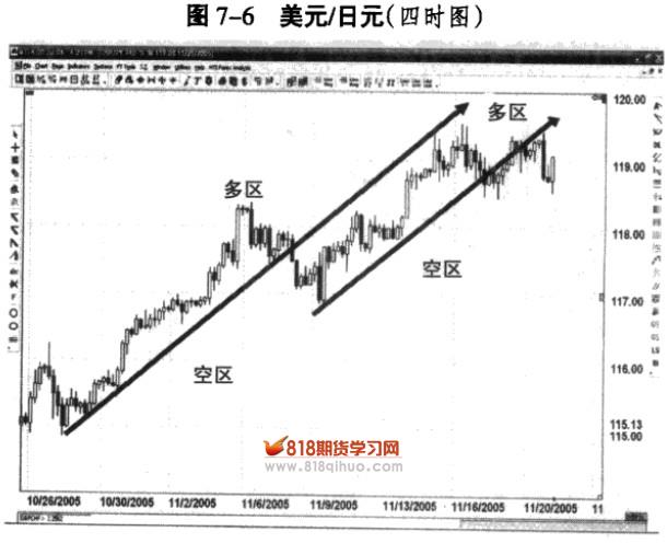 当市场开始突破趋势线的时候,另一个你要注意的是趋势线的角度问题(见图7-4)。交易者用概率或者是百分比思考问题,他们关注高概率和高百分比事件而忽视低概率和低百分比事件。当一个趋势线被穿透,市场就会进入空区或者多区,趋势线的角度有时决定了市场价格是否会发生逆转。