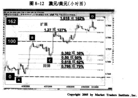 就像俗话说的那样,“告诉我市场此刻在哪里,我就能告诉你它将会去哪里”。如果市场在0.382、0.50或0.618处反弹,它就会压倒性地达到1.618的扩展波峰,也就是被称为D的点。如果反弹在0.786处,它只会达到1.27的扩展处,如图8-12所示。