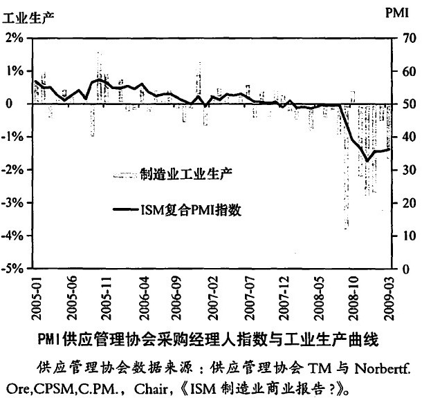 如下表(PMI与工业生产曲线图)所示, PMI水平与工业生产制造业的月增长率紧密相关。对于PMI值,50是制造业正增长与负增长的基本分界限。