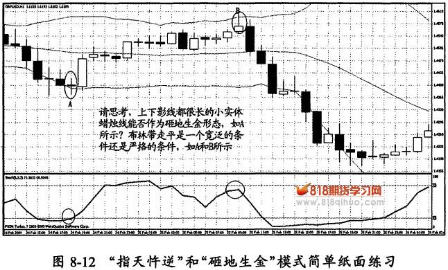 蜡烛线的影线长短和实体大小是我在利用它们来确认方向和位置时主要注意的特征,请看图8-12,这里有两个问题:上下影线都很长的小实体蜡烛线是否能够作为"砸地生金"形态,请看图中的A处;另外布林带走平是一个宽泛的条件,还是严格的条件?请你先写下你的答案,然后再看下面的参考解答。