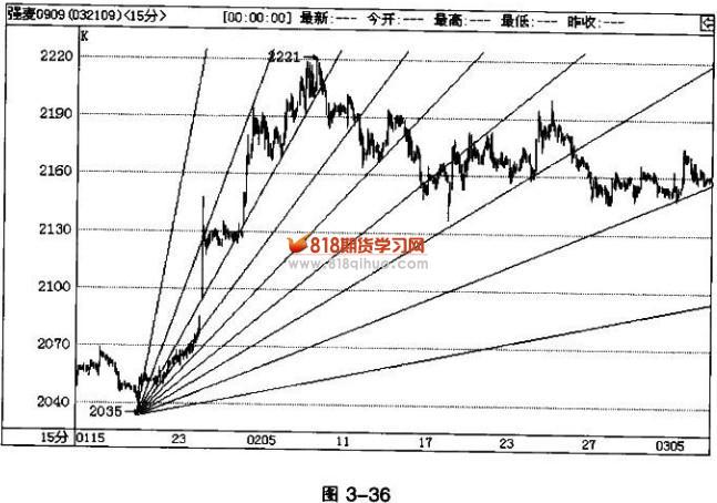 (9)甘氏扇形线:甘氏扇形线是从-点以不同角度画出的一组趋势线,其中45度的趋势线是最重要的一条线。如果价格曲线髙于此线,意味着市场向好,如果低于此线,市场向淡。甘氏扇形线被认为是在上升趋势卜•的一条强大的支撑线,突破此线被认为是-•转向信号。使用时需要设定两点来创建甘氏扇形线,如图3-36所示。