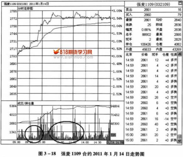 强麦1109合约2011年1月14日开盘之后价格便形成放量上涨的走势,连续两小波上冲之后,分时线形成调整的走势,调整低点受到均价线支撑,并且成交量出现萎缩,形成标准的放量后的缩量现象。