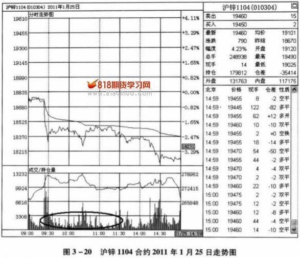 沪锌1104合约2011年1月25日开盘后由于成交量的连续萎缩,使得价格形成窄幅波动的走势,但随后量能的放大促使价格出现快速杀跌的走势。