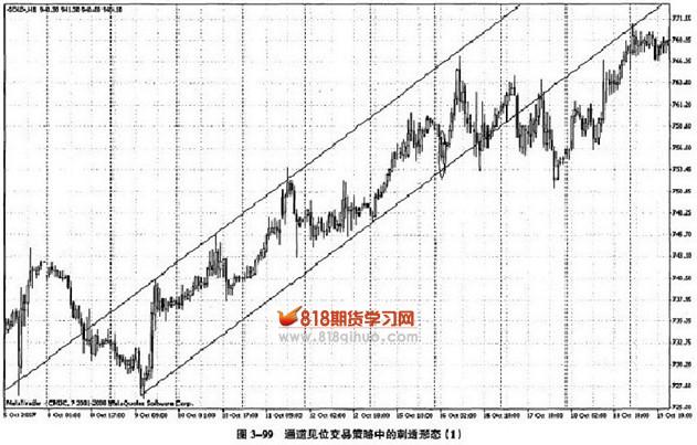 这里有两个例子来演示通道见位交易策略中刺透形态的利用,先看第一个例子,如图3-99所示,这是黄金现货1小时走势图。我们找到近期同级别的两个相邻波段低点,做出上升趋势线,然后作出其平行轨道。作出上升通道之后,我们等待市场跌到上升通道下轨,不久金价跌到了上升趋势线附近,并且出现了刺透形态,于是我们在刺透形态之后的一根K线处入场做多,并将初始停损放置在刺透形态对应的那段上升趋势线之下。