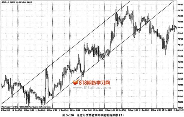 接着,我们再来看第二个通道见位交易利用刺透形态的实例,如图3-100所示,这也是黄金1小时走势图。作出上升趋势线,我们等待市场在触及上升趋势线之后出现某种确认形态,要么以持续下跌K线形态确认趋势转变,要么以反转K线形态确认支撑有效。市场最终以两个临近的刺透形态确认了上升趋势线的支撑有效,我们在第一个刺透形态形成后入场做多,并将停损放置在刺透形态对应的上升趋势线之下。