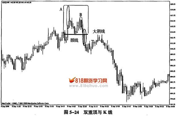 我们接着来看双顶形态与K线的交互验证,请看图5-24,这是现货黄金5分钟走势图。在双顶的第一个顶部,流星形态与其交互验证。并且该流星与其后两根K线组成了一个黄昏之星形态,进一步确认了局部高点。之后,金价小幅度回落之后出现了再度上攻,于是形成了第二个顶部,这时候B处的看跌吞没形态确认了这个顶部,也相当于确认了第一个顶部的阻力有效,于是激进交易者可以在这个位置进场做空,并将初始停损放置在双顶之上一定范围之内。保守交易者则应该等待金价走势跌破双顶的颈线。最后,市场以一根大阴线向下突破颈线,于是交易者可以进场破位做空,并将初始停损放置在颈线之上合适的范围之内。