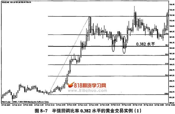 第二个实例请看图8-8,金价从901附近迅速上涨,到911.50附近出现回落,跌到0.382水平才获得支撑。一个看涨母子确认了0.382水平的支撑有效,进场机会形成。
