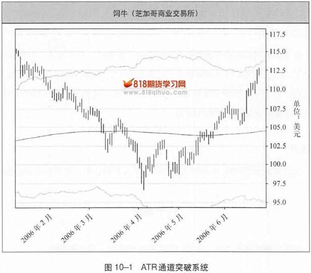 交易者马克·约翰逊在查克·勒博(Chuck LeBeau)的系统交易者俱乐部论坛(www.traderclub com)上普及了一种叫作PGO(Pretty Good Oscillator,绝佳振荡器)的系统,这就是ATR通道突破系统的一种变体。它也是下面所说的布林格突破系统的一个变体。图10-1就是ATR通道突破系统的一个波幅通道。
