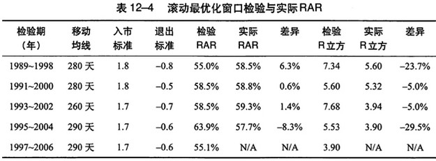 还有一个方住可以帮助你直接体验从虚拟测试到现实交易的转变,那就是攘动最优化窗口(rolling optimization window)。随便选择8~10年前的一天,用这一天之前的所有的数据进行最优化——要使用你平常所用的最优化方怯,作出你平常会作出的权衡决策,就如同你只有截至那一天的数据。当你得出了“最优化”参数值后,再用这一天之后两年内的数据检验一下这些参数值。系统在这两年内的表现怎么样呢?