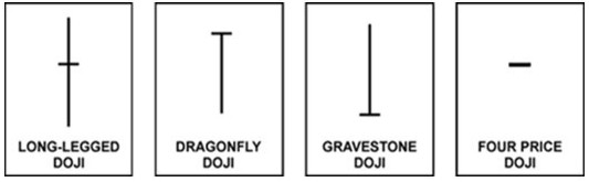 十字星有四种特别形态。它们是长脚十字线(Long-legged Doji)、蜻蜓十字线(Dragonfly Doji)、墓碑十字线(Gravestone Doji)以及一字线(Four Price Doji)。