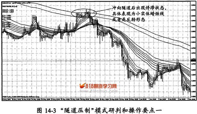 "隧道压制"模式研判和操作的第一个要点是注意汇价冲向隧道后在隧道附近的蜡烛线形态,具体而言是小实体蜡烛线居多,请看图14-3 (1小实体蜡烛线是收敛状态,表明市场处于犹豫之中,如果此后汇价拉出实体较大的阴线,则是市场转而向下的特征。